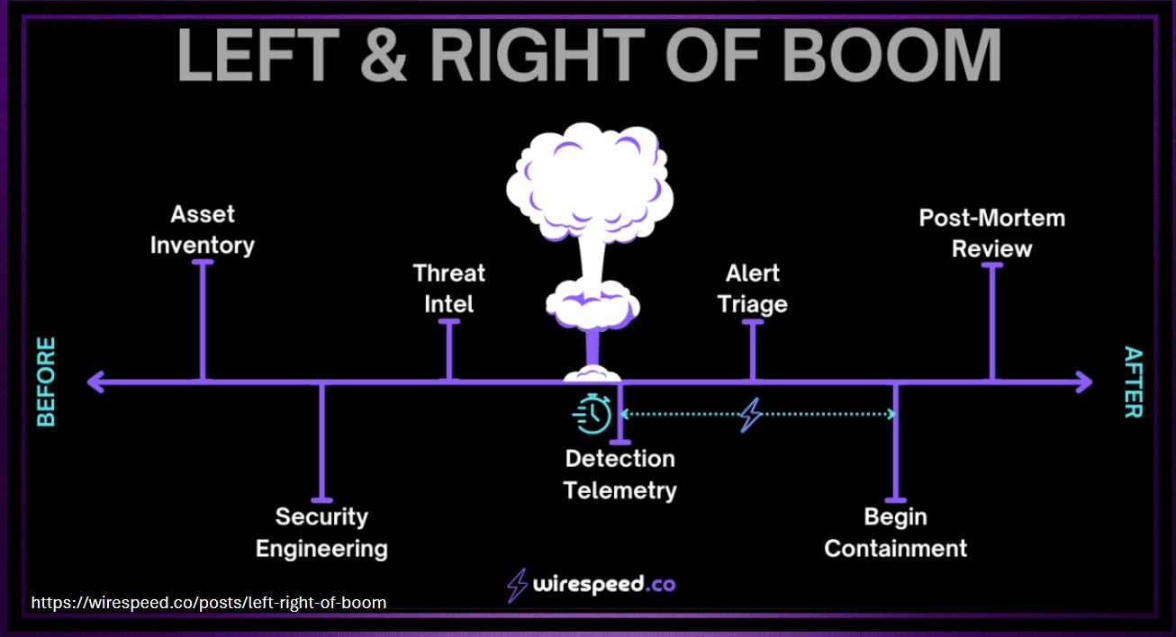 I really enjoy the following graphic from Wirespeed (who was just recently purchased by Coalition, congrats to them) which depicts actions of security teams before and after the detection of an attack has occurred.