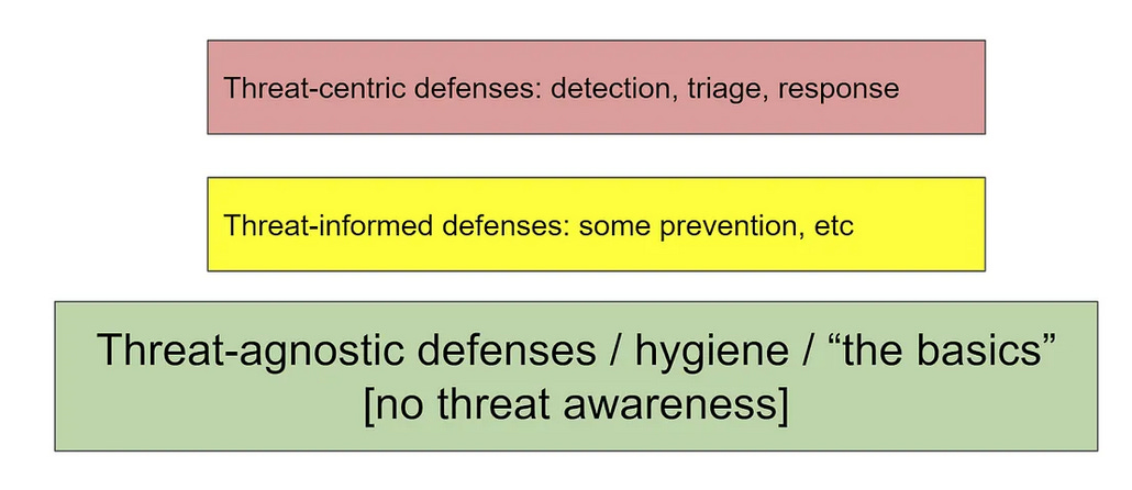 “To start, one can say that foundational levels of security are not and perhaps even should not be threat-centric. After all, much of basic security is just good engineering, no? Threat-informed defense should be built upon foundational cyber-hygiene.