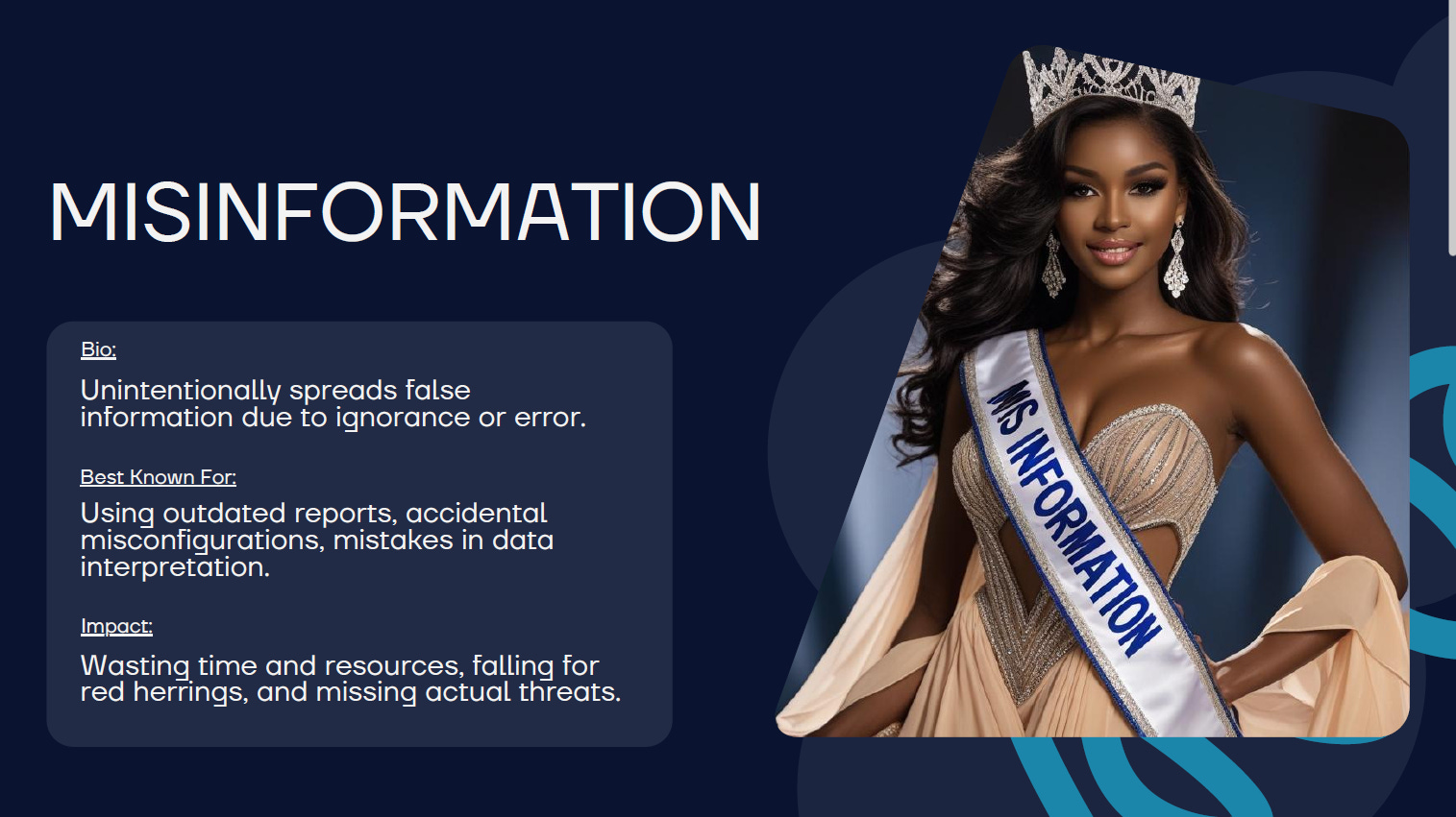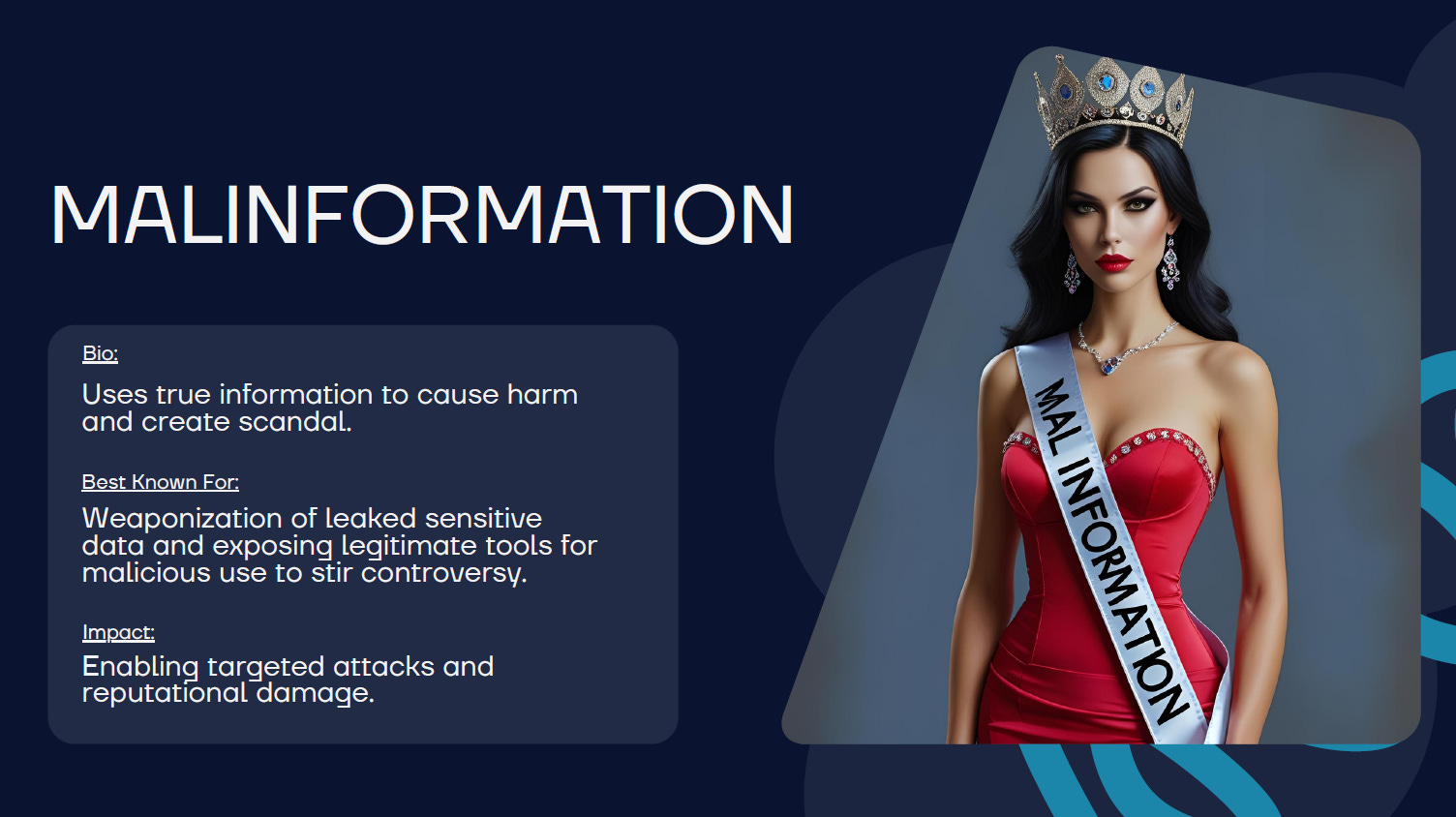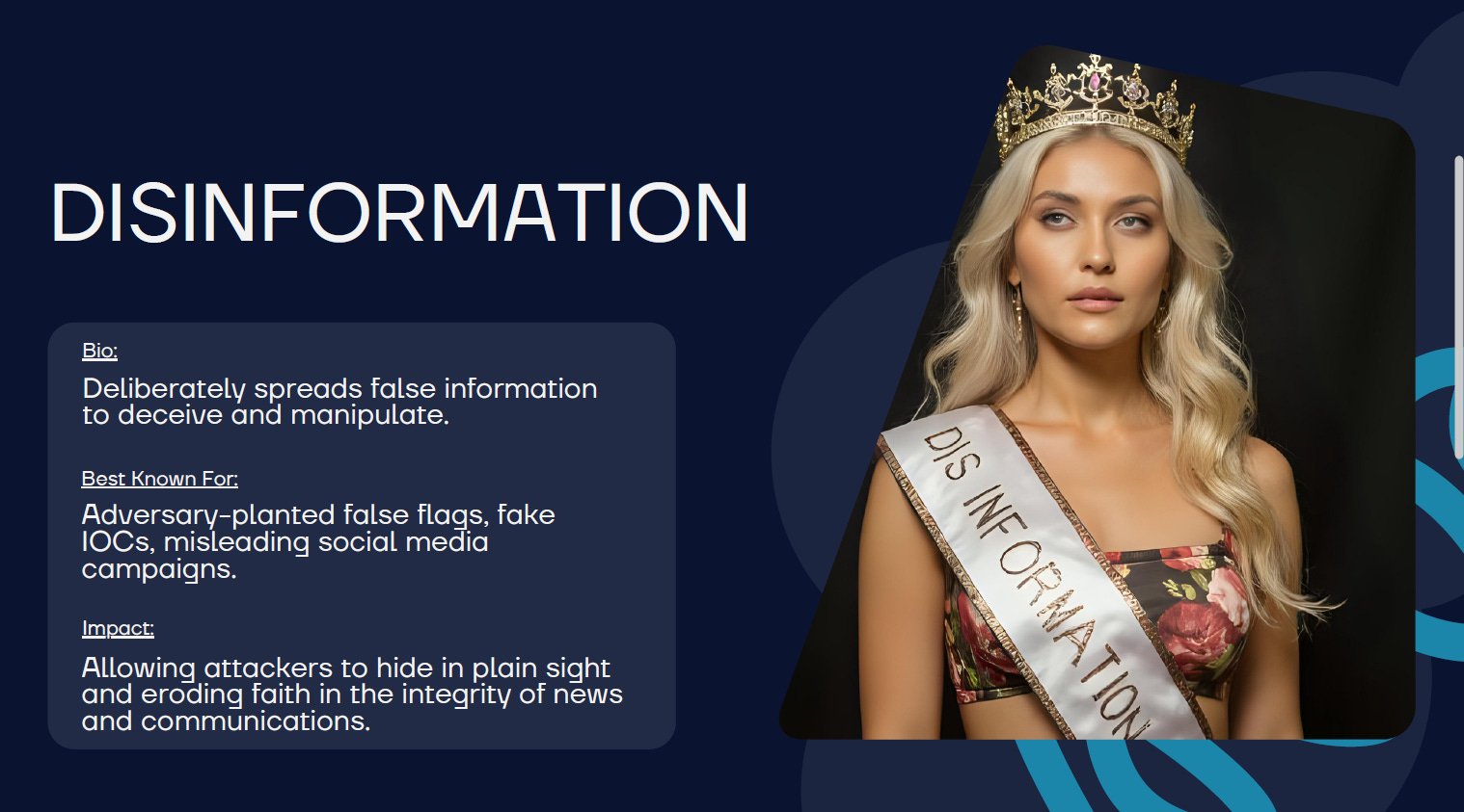 Just as all the different media outlets in the world are competing for your attention, so are the forces behind the intentional broadcast of bad information. The competition for news readers is like a beauty pageant of sorts. Media outlets try to make their stories appealing by being flashy or enticing. Unfortunately, so do the malicious actors. Who are the contestants in this shadow pageant?
