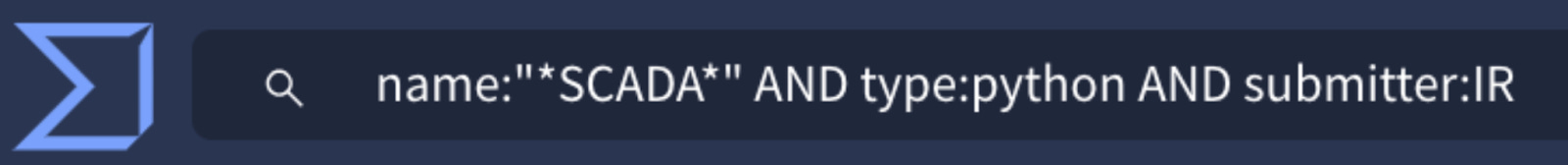 The hunting hypothesis in this case isn’t complicated, and can be boiled down into a simple sentence: “there exists malicious SCADA-related Python binaries uploaded from Iran.” Here, we are focused on MITRE ATT&CK T1059.006 - Command and Scripting Interpreter: Python. This is a rather generic TTP, but that’s not a bad thing when we already must meet the narrow requirement that the sample contain “SCADA” in its name.