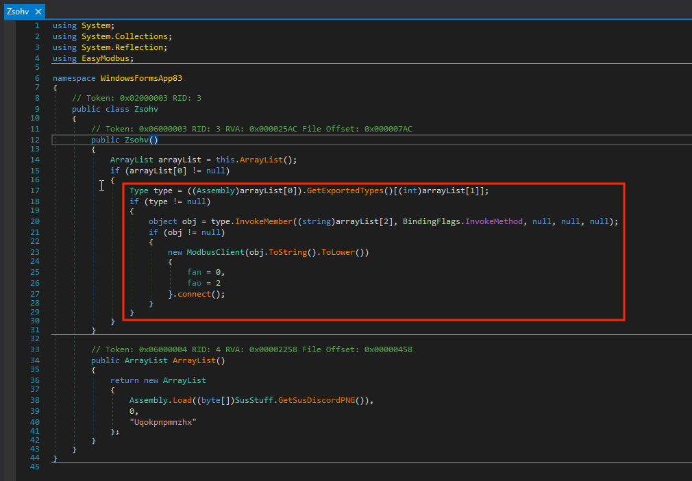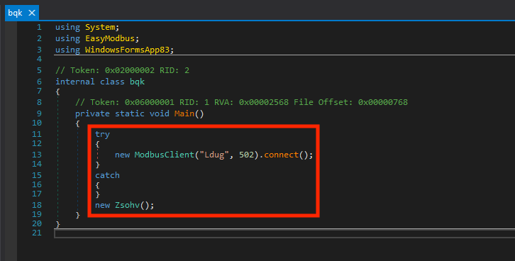 Here, we have our main function with two critical lines: 13 and 18. On line 13, the sample creates a new ModbusClient using the EasyModbus library. This is the library that originally matched our Yara rule. Then, it attempts Modbus connection to the hostname “Ldug” on TCP/502. It then creates a new instance of the “Zsohv” class.
