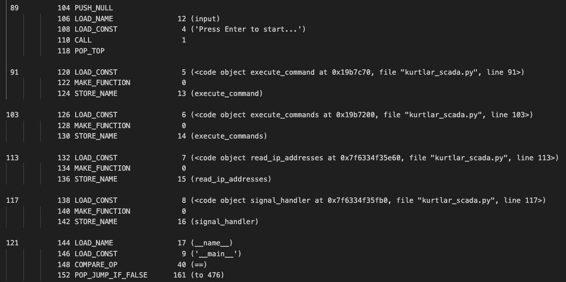 By pivoting in VirusTotal to explore similarly named files, I discovered an additional executable. This is a compiled Python file, a mechanism that bundles your Python code (in PYC format) and the Python interpreter (cpython) into a single binary. Luckily, several tools are available that can extract the bundled PYC and restore it to its original source code. However, KurtLar_SCADA.exe was written in Python 3.12, and there is currently no decompilation tool that actively supports v3.10+. We can view and analyze the Python bytecode ourselves, but this is time-consuming and tedious: