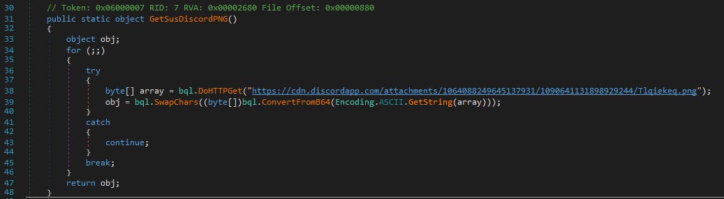 This function makes an HTTP request to a Discord CDN for an obfuscated executable file masquerading as a PNG. It then converts it from Base64 and performs a small character swap algorithm to revert it to a legitimate binary. Pretty straightforward, but also incredibly suspicious.