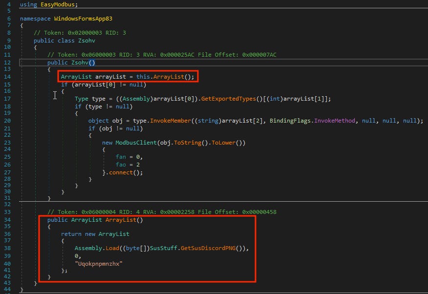 The first line of the Zsohv constructor creates an ArrayList object. This ArrayList is defined in the bottom box. It returns an array containing three elements: the first an Assembly object returned from a function I’ve named “GetSusDiscordPNG()”, the second an integer, and the third an obfuscated string.