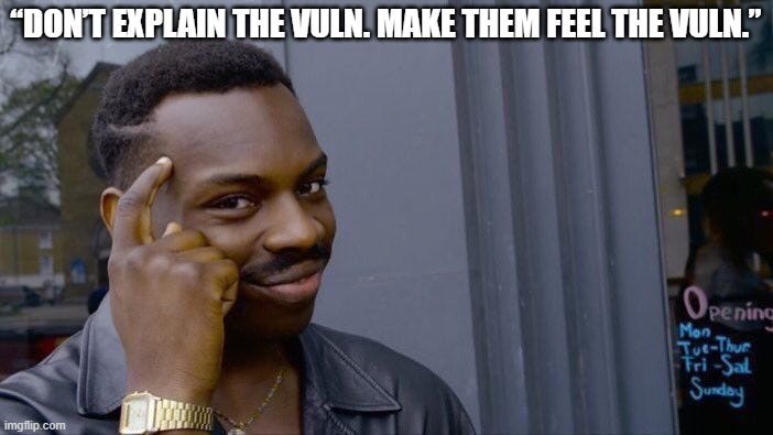 That’s not to say your alert('XSS') didn’t require effort. But if your goal is to drive remediation, motivate prioritization, or spark a "holy crap, we need to fix this NOW" moment, you need more than a text alert pop-up.