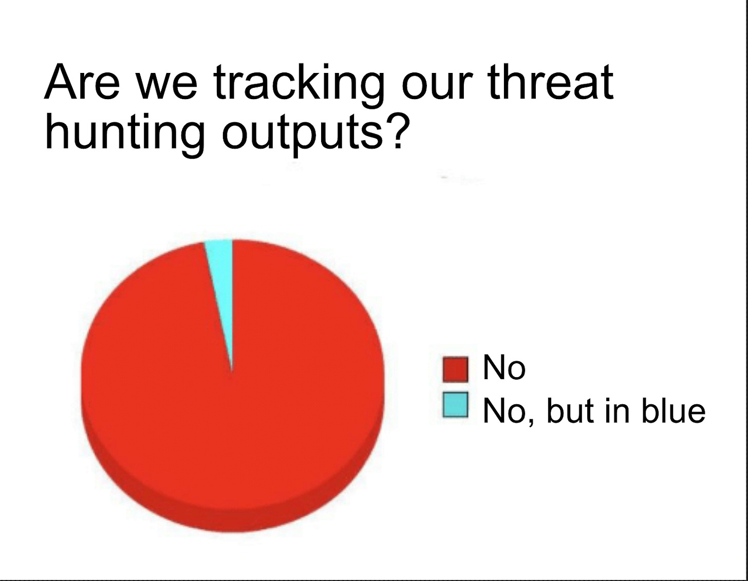 My job as a manager is to constantly show our work and sell the narrative around that work. Threat hunts that happen in a bubble are not helpful to anyone. I encourage you to have threat hunting readouts with at least one team outside of the threat hunting organization. These should discuss what you threat hunted, what you found, and the outputs from the threat hunt.