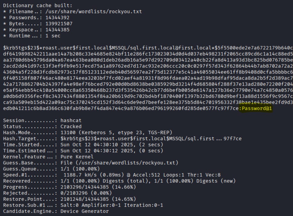 hashcat -m 13100 hashes.txt /usr/share/wordlists/rockyou.txt --force # Kerberoast