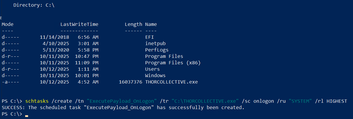 We dropped our little beacon payload on the target, then crafted a fun scheduled task set to run at logon. Log out, log back in, cue the triumphant beacon callback to Sliver.