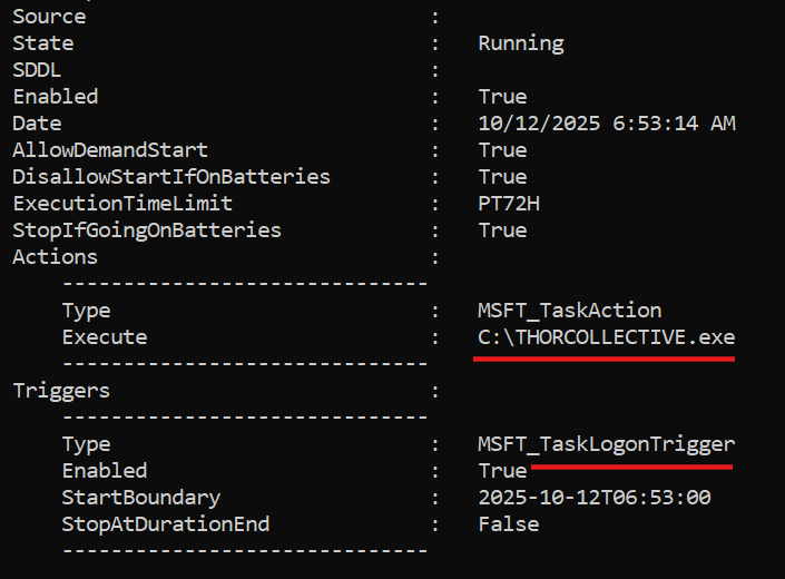 What it finds: OS info, current logon sessions, scheduled tasks (including your task), installed hotfixes. Functionally similar outputs to WinPEAS but in-memory.